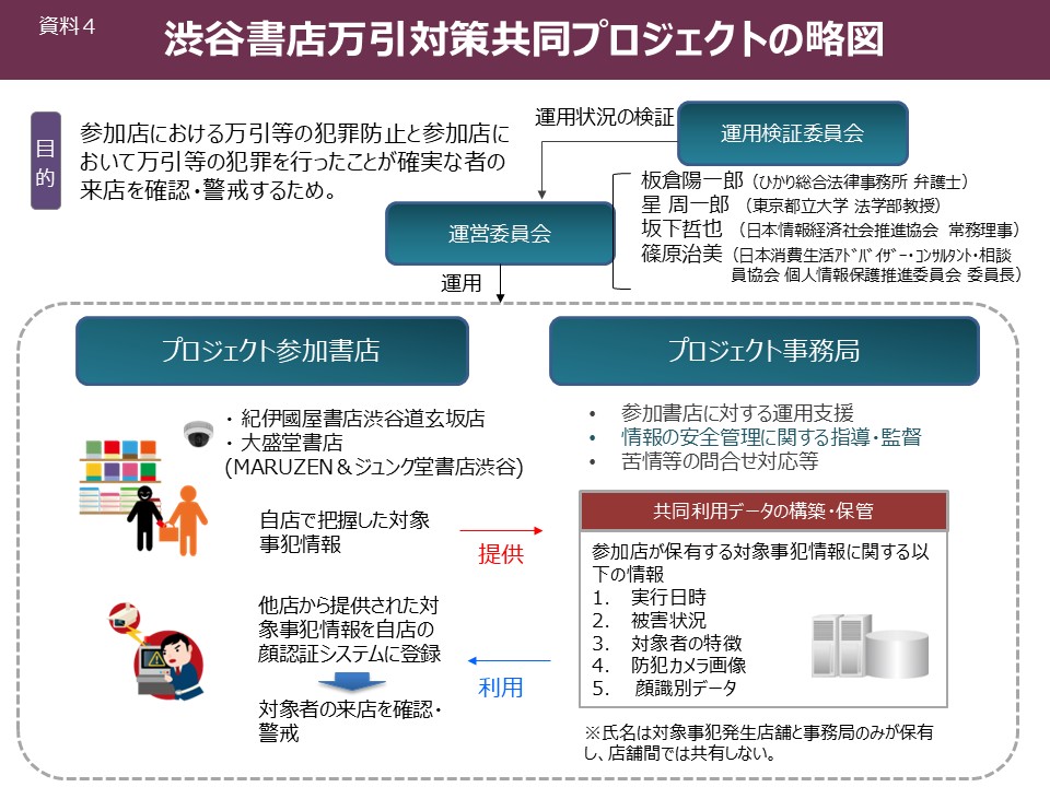 渋谷プロジェクトに参加する渋谷区内の三書店(京王書籍販売株式会社啓文堂書店渋谷店、大盛堂商事株式会社書店部大盛堂書店、株式会社丸善ジュンク堂書店MARUZEN&ジュンク堂書店渋谷店)及び全国万引犯罪防止機構の関係者で構成され、渋谷プロジェクトの適切な運用を行います。 - 渋谷プロジェクトにおける個人情報取扱事業者の名称